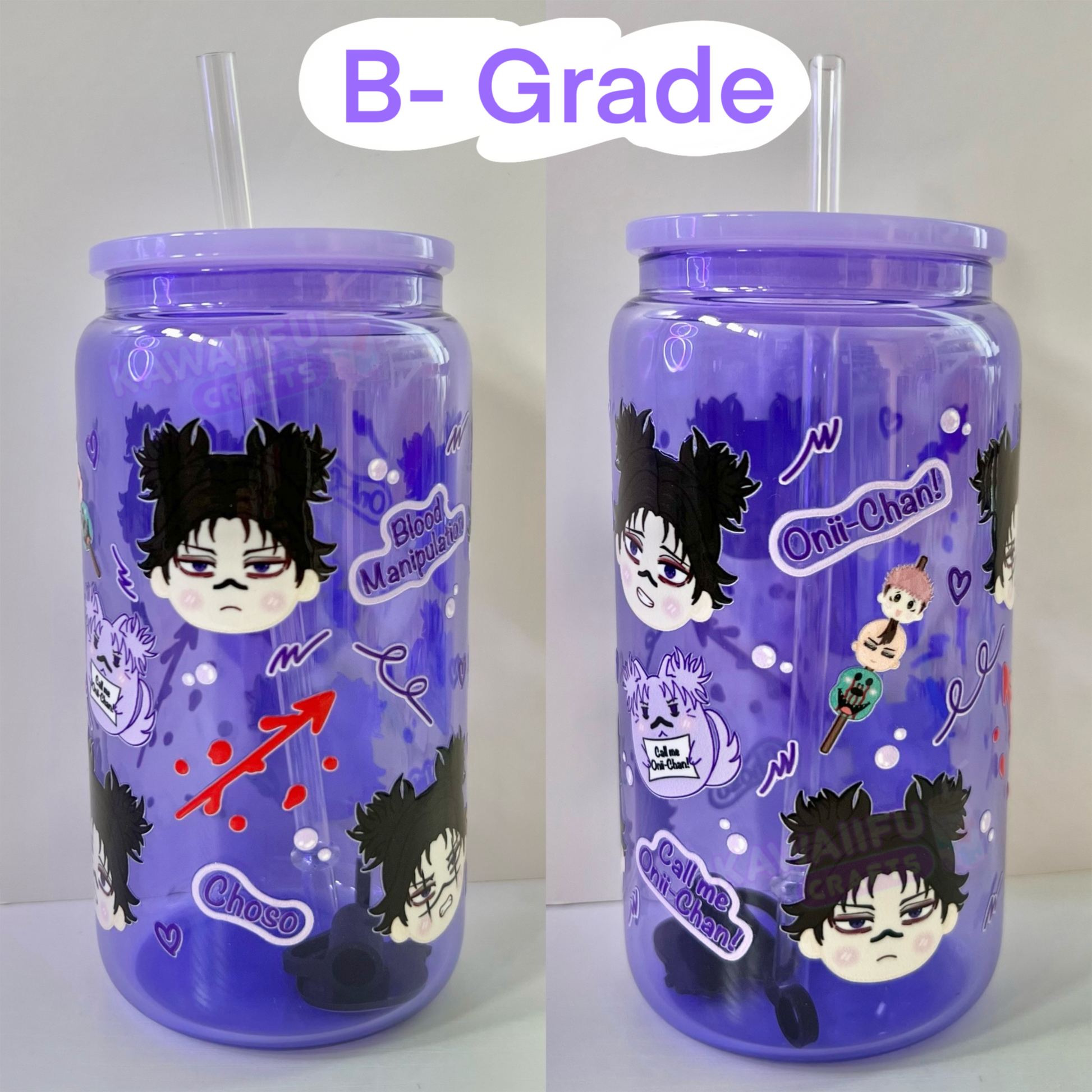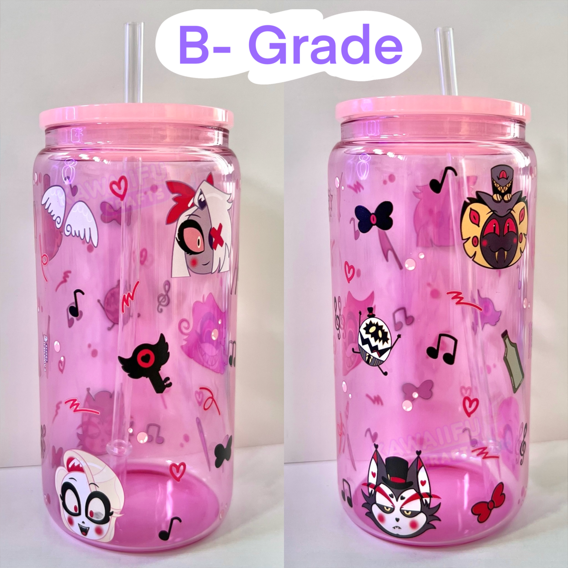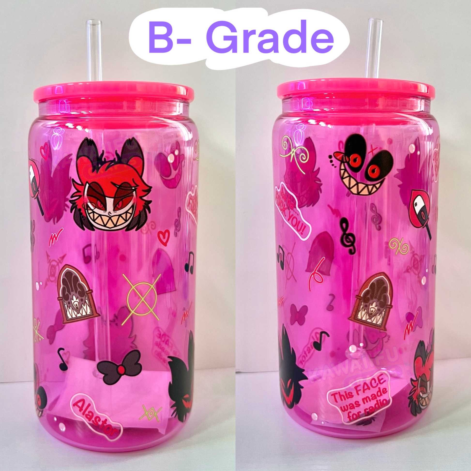 B-Grade: products are fully functional and unique with noticeable imperfections such as, scratches, patchy, discoloration and stains on the print/glass.